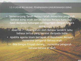 Bahasa melayu- unsur asing dalam bahasa melayu sem 1 1. SEJARAH DAN PERKEMBANGAN BAHASA MELAYU Asal Usul Bahasa Melayu Asal usul perkataan Melayu masih belum dapat disahkan oleh sejarawan. Penulis lirik lagu-lagu Tamil tempatan dan penyanyinya.